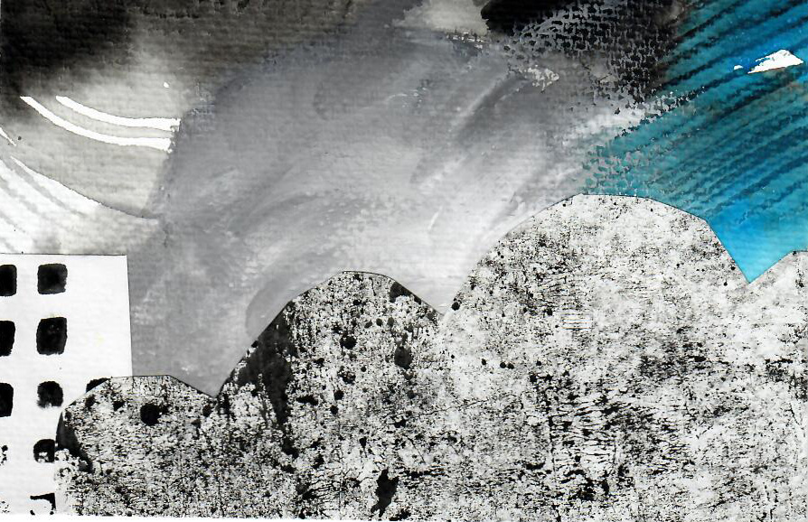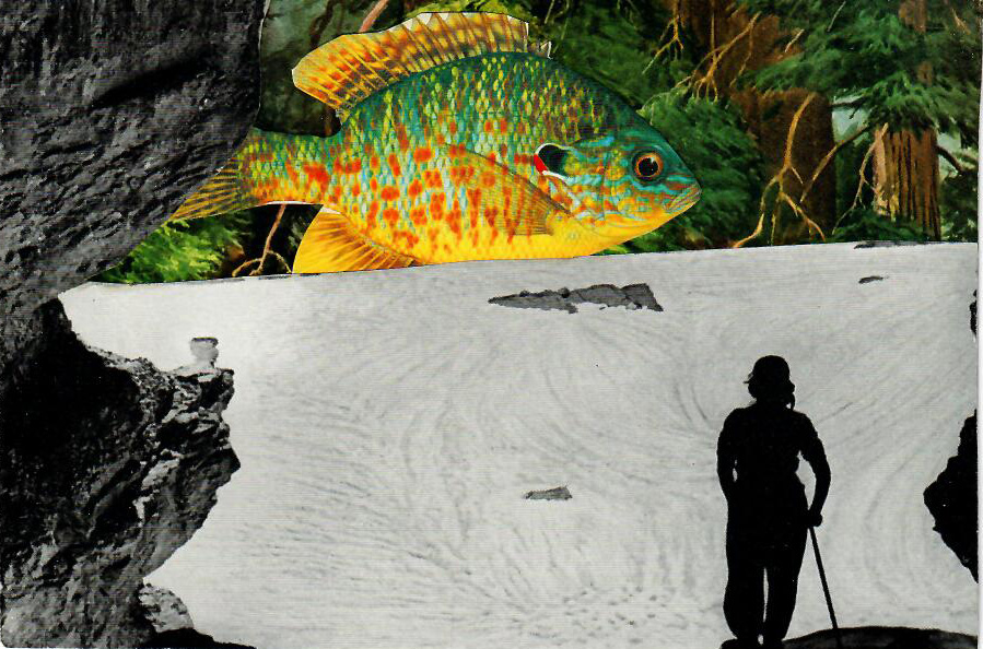 "Discovery" Fish in the trees above someone standing in snow. Collage.