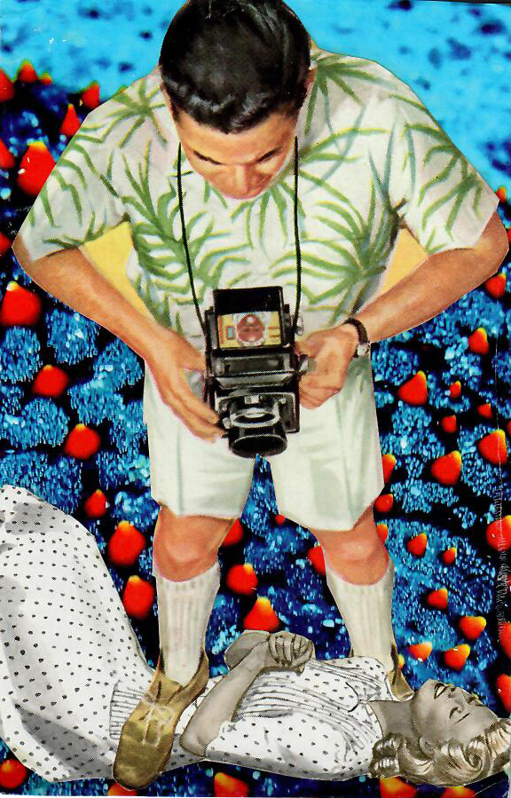 "Patriarchy" A man taking a picture while standing on a woman on the ground. Collage.