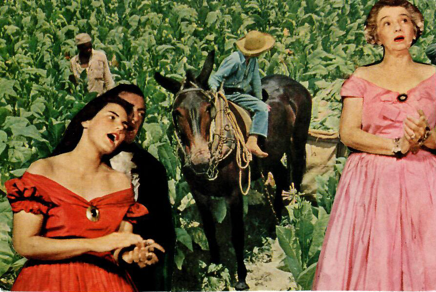 2 field workers and a donkey in a field with 3 dressed up people. Collage.