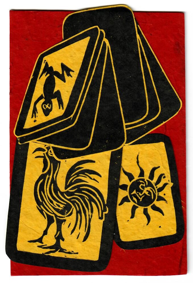 "It's All in the Cards." Block print of playing cards with a frog, rooster, and sun.