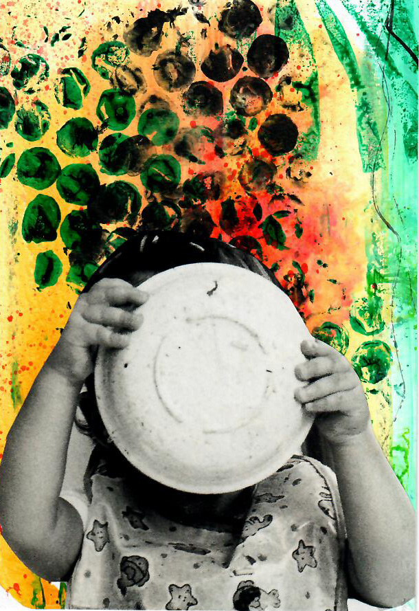 Child holding a bowl up to their face on an abstract background. Mixed media.